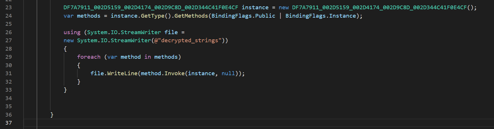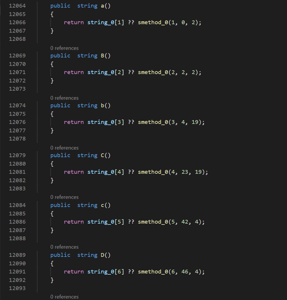 Имея декомпилированный код, мы можем написать код, который будет декодировать строки, с помощью вызова всех функций в данном классе