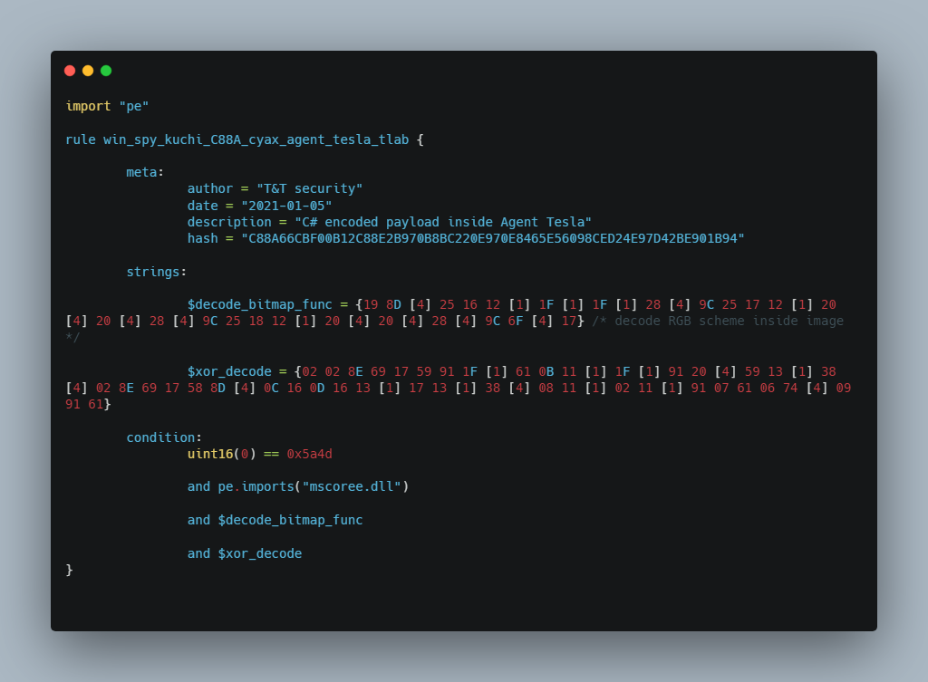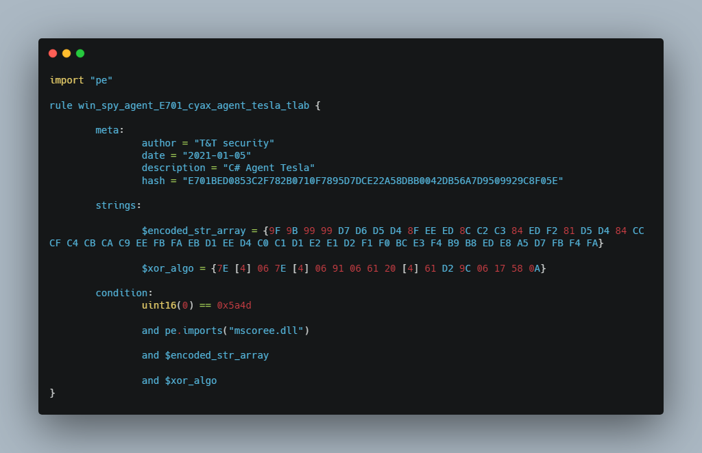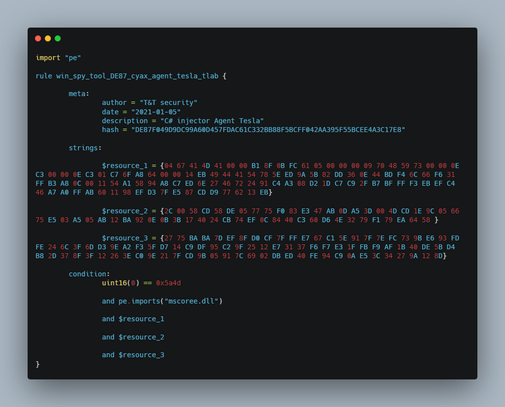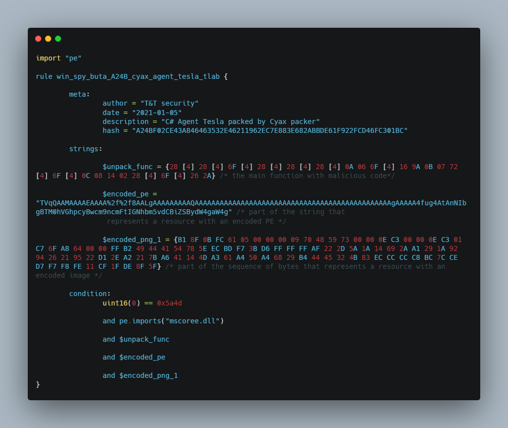 T&T security предоставляет своим клиентам yara правила для каждого вредоносного файла. Yara правило для образца A24BF02CE43A846463532E46211962EC7E883E682ABBDE61F922FCD46FC301BC: