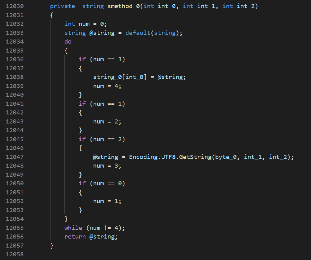 Алгоритм кодирования строк находится в классе DF7A7911_002D5159_002D4174_002D9C8D_002D344C41F0E4CF. В нем определен массив байт из 12005 элементов