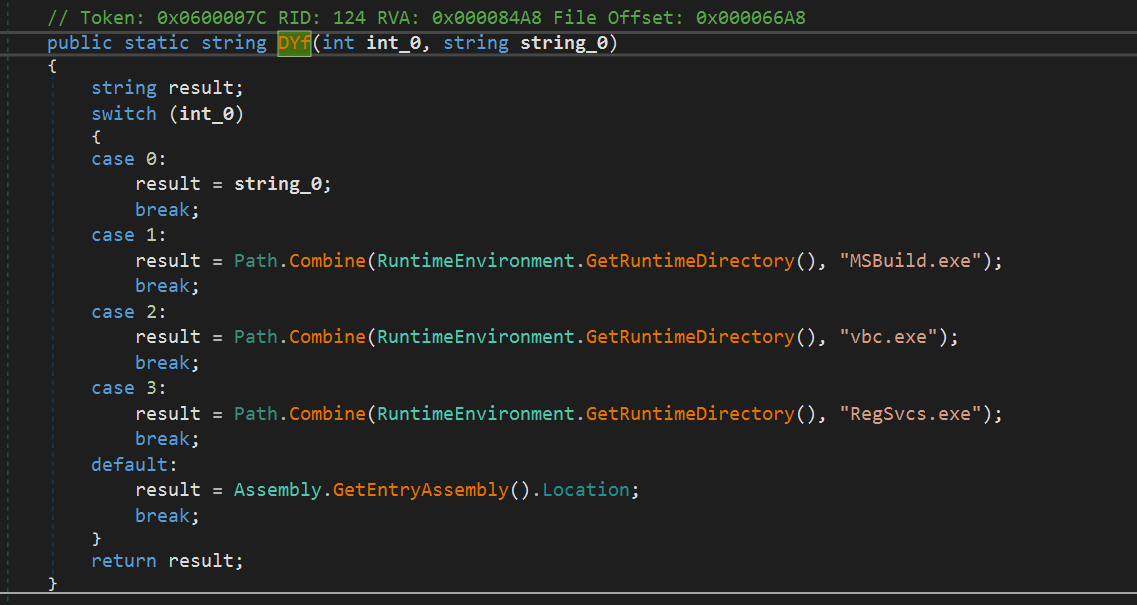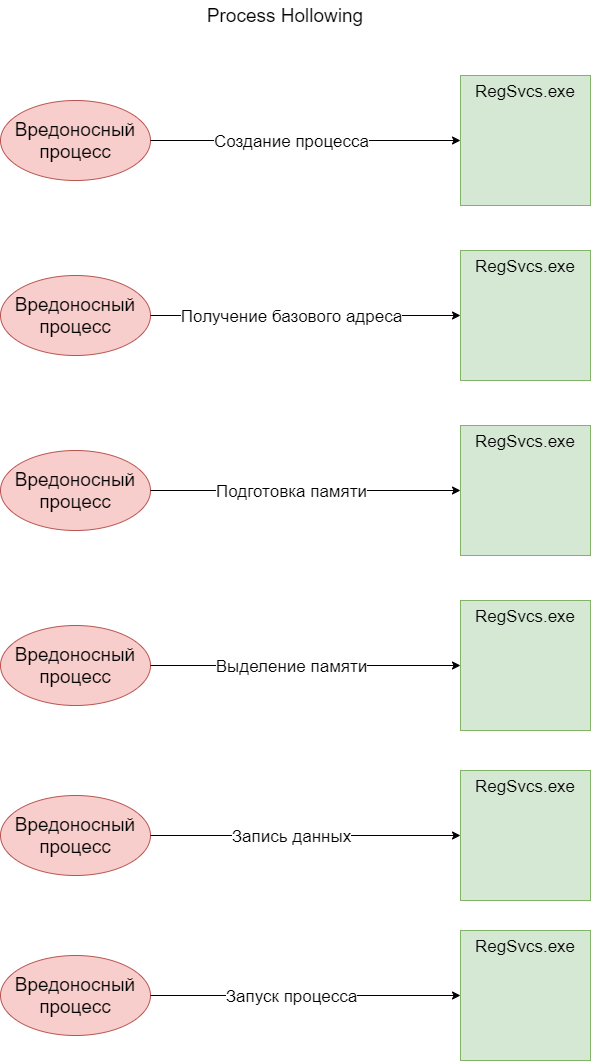 В зависимости от первого параметра, происходит внедрение в один из легитимных процессов. В данном случае в процесс RegSvcs.exe