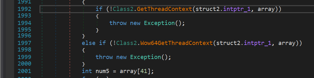 Далее, с помощью функции GetThreadContext и взятия 41 байта из результата, идет получение структуры PEB целевого процесса, которая содержит информацию о процессе.