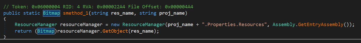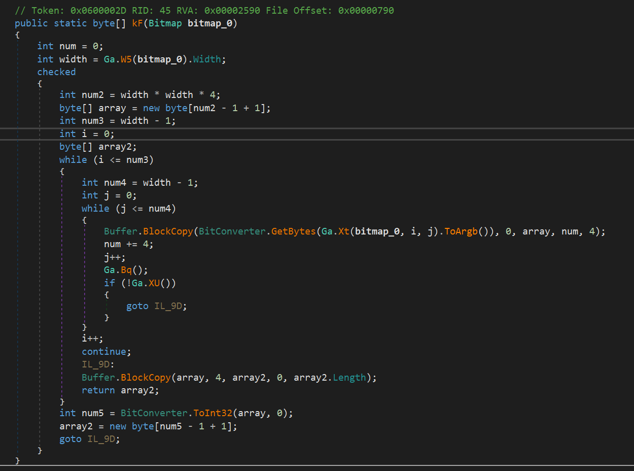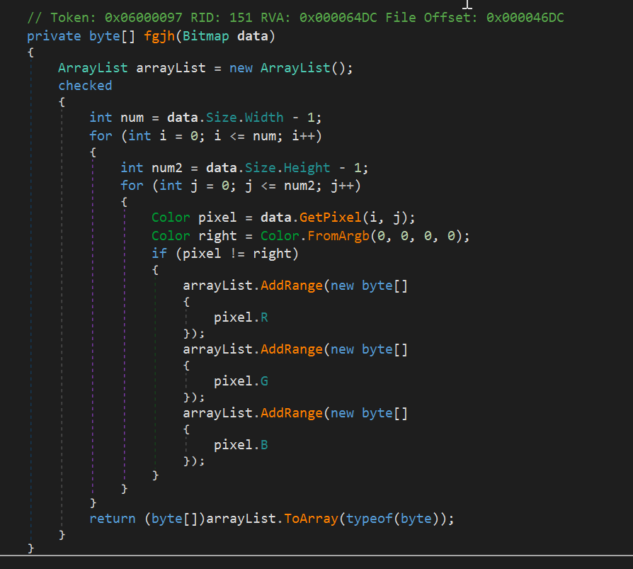 Bitmap декодируется в массив байтов. Данный способ декодирования полезной нагрузки описан в статье Commodity .NET Packers use Embedded Images to Hide Payloads следуя которой мы можем однозначно идентифицировать, что данный образец использует упаковщик “Cyax”. Суть алгоритма в использовании RGB модели PNG изображения и формирование соответствующего ей байтового массива.