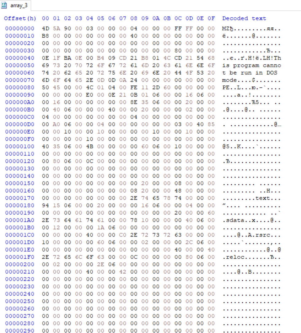На первой стадии, исследуемый образец распаковывает ресурс под именем dx, который является url-encoded base64 строкой. В результате получается PE файл.
