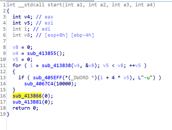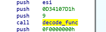 Lokibot использует API hashing для сокрытия списка импортируемых функций. Для этого на стек кладется заранее известное закодированное имя функции. Аргумент который кладется последним на стек - это id библиотеки откуда нужно взять функцию (0 - kernel32, …). Нахождение функции Sleep