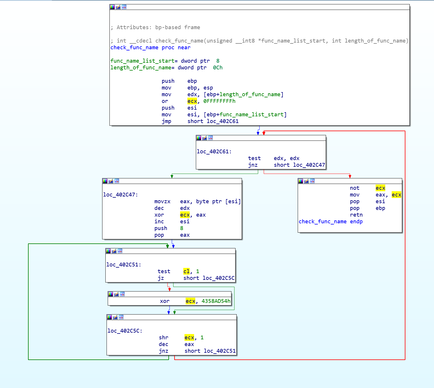 Функция нахождения нужных функций состоит из операции xor с заранее известным ключом 0x4358ad54