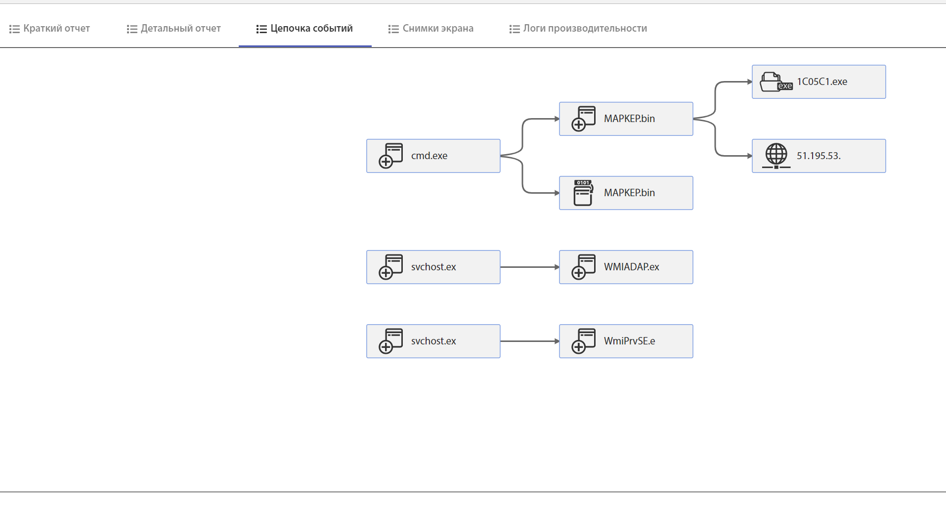 В системе tLab можно открыть Цепочку событий, в которой видно дерево процессов. Здесь виден доступ к C&C серверу и открытие чужого исполняемого файла