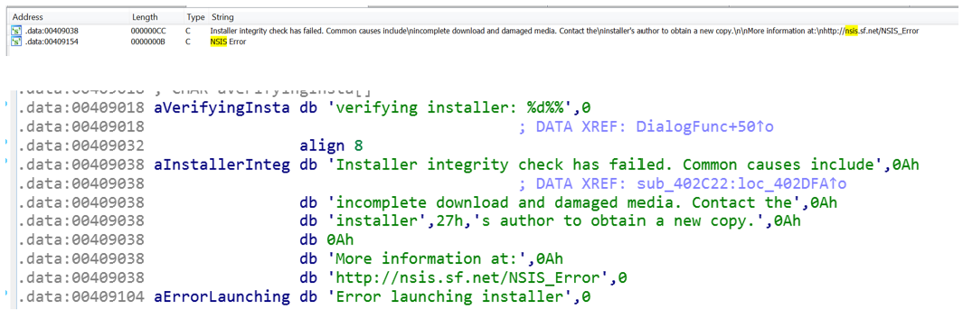 В декодированном EXE (вредоносная нагрузка) файле обнаруживаются строки, связанные с установщиком NSIS